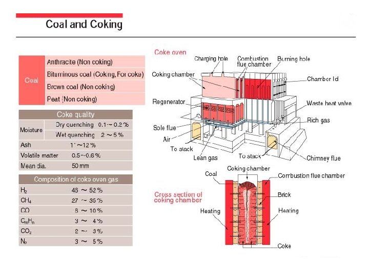 Cokes that meet these requirements are derived from bituminous coals that combine good coking properties with low ash and sulfur contents. In the coke oven, the raw coal obtained by crushing and blending is charged into the coke chamber, where it is then baked (carbonized) by indirect heating at 1, 200 -1, 300 C for 14 -18 hours to form coke that contains about 90% fixed carbon. The coking process also produces such by-products as gas, coal tar, and pitch which can be refined and treated into useful secondary products such as fuel gas, pure hydrogen gas, chemical products such as benzene, toluene, xylene, naphthalene, dye, and carbon fibers. The life of a coke oven is about 40 years. Technical developments are being made to provide new technology to (i) produce coke (ii) establish a cokeless iron making process both of which will make it possible to select raw coal materials more freely and will cause less environmental pollution.