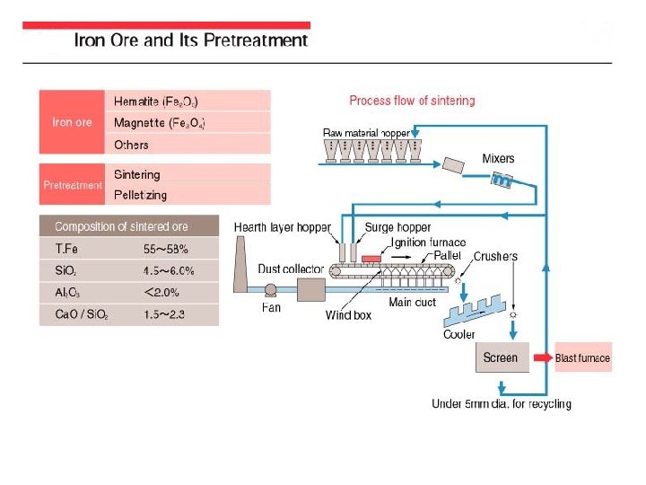 High-grade iron ore is crushed for sizing, producing both fine ore as well as lump ore. To beneficiate low-grade ore, it is first pulverized into finer particles called pulverized ore. Both fine and pulverized ores are then subjected to pretreatments before they are charged into the Blast Furnace (BF); that is, the fine ore is processed into sintered ore by sintering, and pulverized ore is processed into pellets by pelletizing. The proportions of iron ores charged into the BF are, at present, 15% lump ore, 10% pellets, and 75% sintered ore. Thus, pretreated iron ores represent a large majority of the ore used. In the SINTERING PROCESS, fine ores 2 -3 mm in diameter are mixed with coke breeze as a fuel. Burnt limestone powder is used as a flux. These materials are charged in an iron box called a pallet before being ignited. Fine ore particles are partially melted and combined by the combustion heat of the coke to form an agglomerate which is then subjected to crushing and screening processes in order to obtain sintered ore 15 -30 mm in diameter.