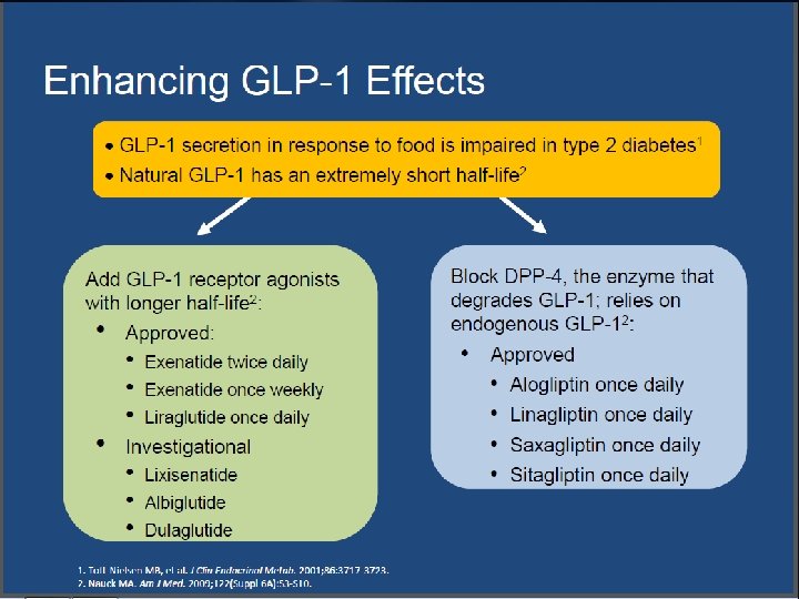 Incretins in T 2 DM: Decreased Postprandial Levels of GLP-1 in Patients With Type 2 Diabetes * * * * (10 -15) Meal Started Finished *P<0. 05, Type 2 diabetes vs NGT. Reprinted with permission from Toft-Nielsen MB et al. J Clin Endocrinol Metab. 2001; 86: 3717– 3723. Copyright © 2001, The Endocrine Society.