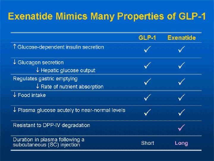 Incretin mimetics Exenatide • Resistant to DPP-IV inactivation. • Following injection, it is measurably present in plasma for up to 10 hours. • Suitable for twice a day administration by subcutaneous injection. Regul Pept. 2004; 117: 77 -88. Am J Health Syst Pharm. 2005; 62: 173 -181.