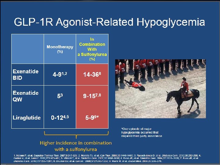 Meta-analysis: subjects achieving Hb. A 1 c target and no weight gain TZD SU Liraglutide 1. 2 mg Exenatide 10 μg Liraglutide 1. 8 mg 9% Glargine 15% Sitagliptin 16% 100 mg 17% 32% 39% 50% Adapted from Zinman et al. Diabetes Obes Metab 2011; 14: 77– 82 More patients treated with liraglutide (1. 2 or 1. 8 mg) or exenatide BID achieved a composite endpoint of Hb. A 1 c <7. 0% and no weight gain compared with the DPP-4 inhibitor, sitagliptin.