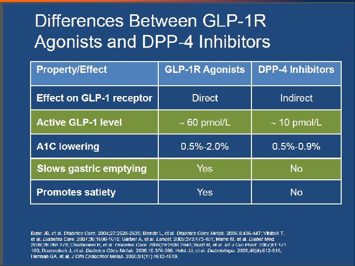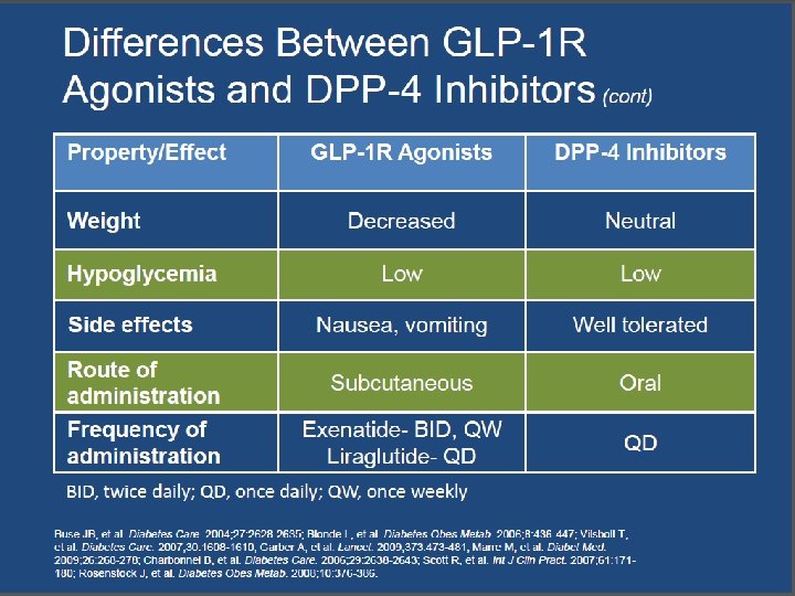 Conclusions • Compared with DPP-4 inhibitors, GLP-1 receptor agonists are associated with: • greater Hb. A 1 c reduction and greater weight loss • similar low risk of hypoglycaemia but an increased incidence of gastrointestinal events • greater improvements in CV biomarkers and selected lipids • greater overall treatment satisfaction • Switching from a DPP-4 inhibitor to a GLP-1 receptor agonists was associated with: • significant additional Hb. A 1 c reductions • significant weight loss • improved overall treatment satisfaction without a change in perceived treatment flexibility or convenience