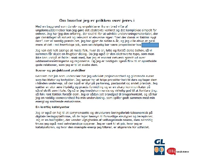 5 profiler – 5 forløb • Fra gymnasielærer i dansk og mediefag til marketing i mindre virksomhed Stress – afklaring – kursus – praktik – løntilskud - job • Fra gymnasielærer i matematik til udvikling og programmering i privat firma - et enkelt opslag på Linked. In. • Fra gymnasielærer i musik til folkeskolelærer Vikariat på friskole via nabo – meritlæreruddannelse – fastansættelse folkeskole • Fra gymnasielærer i matematik og kemi til fuldmægtig i Toldstyrelsen Afklarende samtaler – målrettet og vinklet ansøgningsmateriale – opslået stilling - job • Fra gymnasielærer til gymnasielærer igen…. Netværk – kurser – held – timing – god kommunikation og alt muligt andet