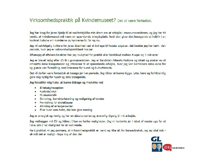 Det vi har at gøre godt med • Introduktionssamtale Struktureret overblik over situation, ønsker og behov • Tre karrieresamtaler med fast karriererådgiver (mulighed for ekstra samtaler) • En workshop tilpasset GL’ere Perspektiver og redskaber ift. arbejdsmarked, kompetenceafklaring og jobsøgning Andre muligheder • MA workshops Løbende udbud. Flere er relevante for GL-kandidater • Coaching ved behov for anden eller ekstra støtte, hvis noget står i vejen for at komme godt videre • Opkvalificering Rådgivning om efteruddannelse. GL yder op til 15. 000 kr. i tilskud. Skal have jobperspektiv og være anbefalet af karriererådgiver • Socialrådgiver Camilla Beyer-Nielsen hos GL kan rådgive om fx sygedagpenge, flexjob, syge pårørende, boligsituation, møder med kommune o. a,