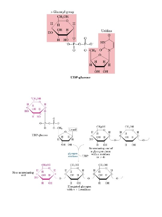 Biosíntesis del glucógeno (Glucogenogénesis) Etapas de la glucogenogénesis: 1. Fosforilación de la glucosa 2. Isomerización a Glucosa-1 -P 3. Formación de UDP-glucosa 4. Transferencia de glucosilos: (1 4).