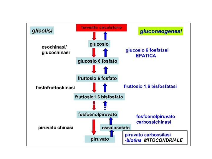 GLUCONEOGENESI • La gluconeogenesi non è semplicemente l’ inverso della glicolisi: alcune reazioni sono diverse • L’ ultima reazione è catalizzata dalla glucosio 6 - fosfatasi: glucosio 6 -fosfato + H 2 O → glucosio + Pi • Il glucosio viene trasportato fuori dagli epatociti e si riversa in circolo • Il fegato è l’ unico organo ad avere tale enzima e quindi è l’unico organo che può rilasciare glucosio nel sangue: il fegato controlla la glicemia