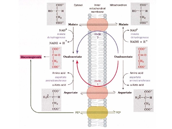 Transport between the mitochondria and the cytosol Generation of oxaloacetate occurs in the mitochondria only, but, gluconeogenesis occurs in the cytosol. PEPCK is distributed between both compartments in humans, while in mice, it is only found in the cytosol. In rabbits, it is found in the mitochondria. Either PEP must be transported across the membranes or oxaloacetate has to be transported. PEP transport systems are seen in the mitochondria but oxaloacetate can not be transported directly in or out of the mitochondria.