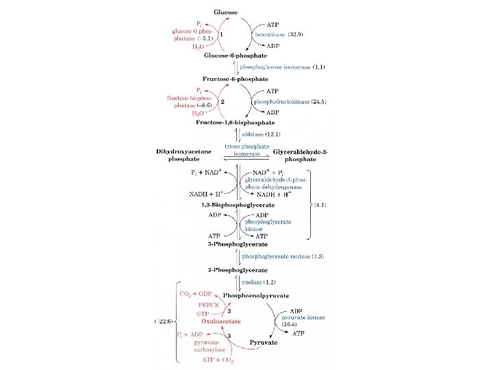 Hydrolytic reactions bypass PFK and Hexokinase The hydrolysis of fructose-1, 6 -phosphate and glucose -6 - phosphate are separate enzymes from glycolysis. Glucose-6 -phosphatase is only found in the liver and kidney. The liver is the primary organ for gluconeogenesis. Glucose + 2 NAD+ + 2 ADP + 2 Pi 2 Pyruvate +2 NADH + 4 H+ + 2 ATP + 2 H 2 O 2 Pyruvate +2 NADH + 4 H+ + 4 ATP + 2 GTP + 6 H 2 O glucose + 2 NAD+ + 4 ATP + 2 GDP + 4 Pi 2 ATP + 2 GTP + 4 H 2 O 2 ADP + 2 GTP + 4 Pi