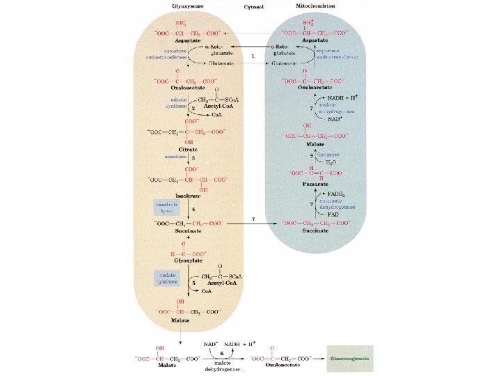 The glyoxylate pathway Only plants have the ability to convert acetyl-Co. A to Oxaloacetate directly without producing reducing equilivents of NADH. This is done in the glyoxyzome, separate from the mitochondria and allows a replenishment of oxaloacetate. Isocitrate lyase - cleaves isocitrate into succinate and glyoxylate. The succinate goes to the mitochondria Malate synthase makes malate from glyoxylate and Acetyl. Co. A. The Oxaloacetate can go directly to carbohydrate synthesis.