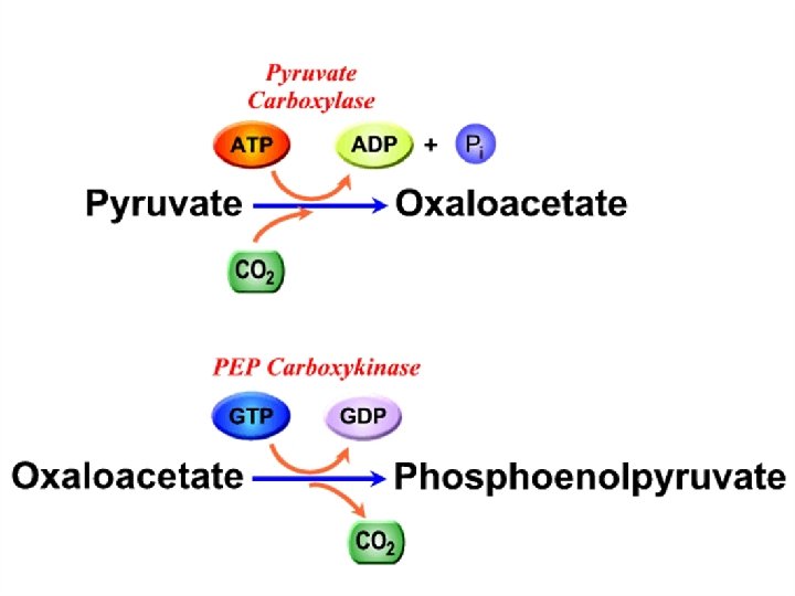 In the cytosol • Malate is converted to oxaloacetate. • Oxaloacetate is converted to PEP by phosphoenolpyruvate carboxykinase