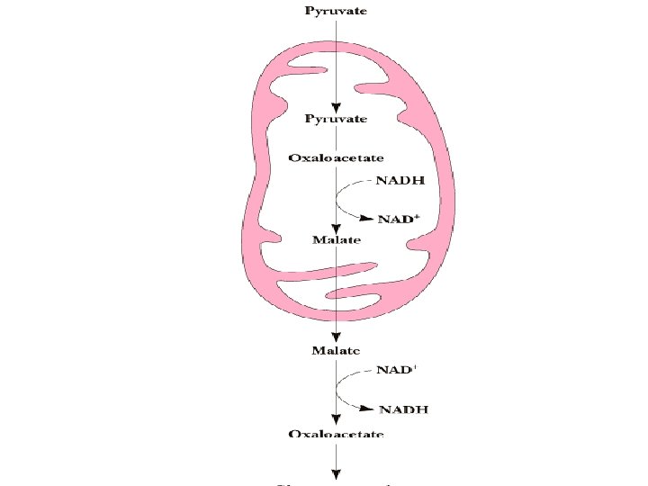 In the mitochondrial matrix • Pyruvate in the mitochondria will be converted to oxaloacetate, by pyruvate carboxylase. • Oxaloacetate is converted to malate • Malate is then transported back to the cytosol