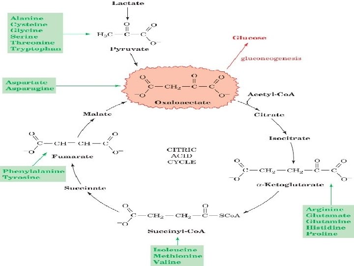 19 Amino Acids are Glucogenic, 14 are Purely Glucogenic Pyruvate Amino acid catabolism Citrate Isocitrate a-ketoglutarate Succinyl-Co. A Succinate Fumarate Malate TCA Intermediates TCA oxaloacetate