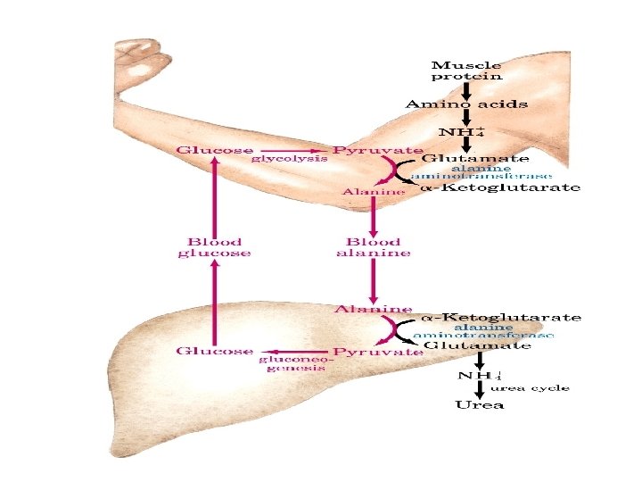 The Glucose–Alanine Cycle • Alanine serves as a "shuttle" for pyruvate from the muscles to the liver. • Pyruvate produced by glycolysis in muscles is transaminated to alanine. • Alanine is transported to the liver, where it is re-converted to pyruvate and used for gluconeogenesis