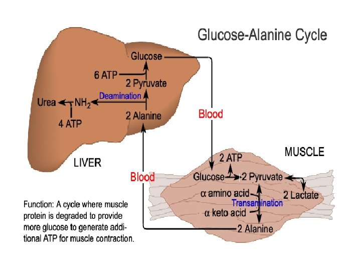Carbon sources for gluconeogenesis Glucose-alanine cycle: Ø Glucose oxidation produces pyruvate which can undergo transamination to alanine in liver. This reaction is catalyzed by alanine transaminase (ALT). Ø Additionally, during fasting, skeletal muscle protein is degraded yielding high amount of alanine which then enters the blood stream and is transported to the liver. Ø In liver, alanine is converted back to pyruvate which is then a source of carbon atoms for gluconeogenesis. The newly formed glucose can then enter the blood for delivery back to the muscle.