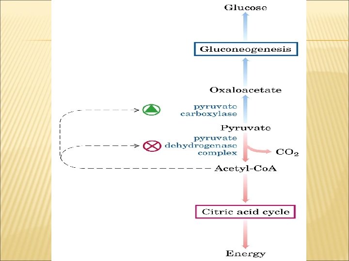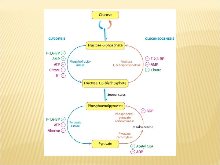 GLUKONEOGENEZIN DÜZENLENMESI Glikolizin negatif effektörleri glukoneogenezin pozitif effektörleridir. FFK-1 ve F 1, 6 BPaz major düzenlenme yeridir. • Fruktoz-2, 6 -bifosfat, F 2, 6 BP F 1, 6 BPazın güçlü negatif effektörüdür. • F 2, 6 BP düzeyi glukagon ve katekolamin etkisi ile azalır. Bunlar etkilerini c. AMP bağımlı protein kinaz A ile yürütürler.
