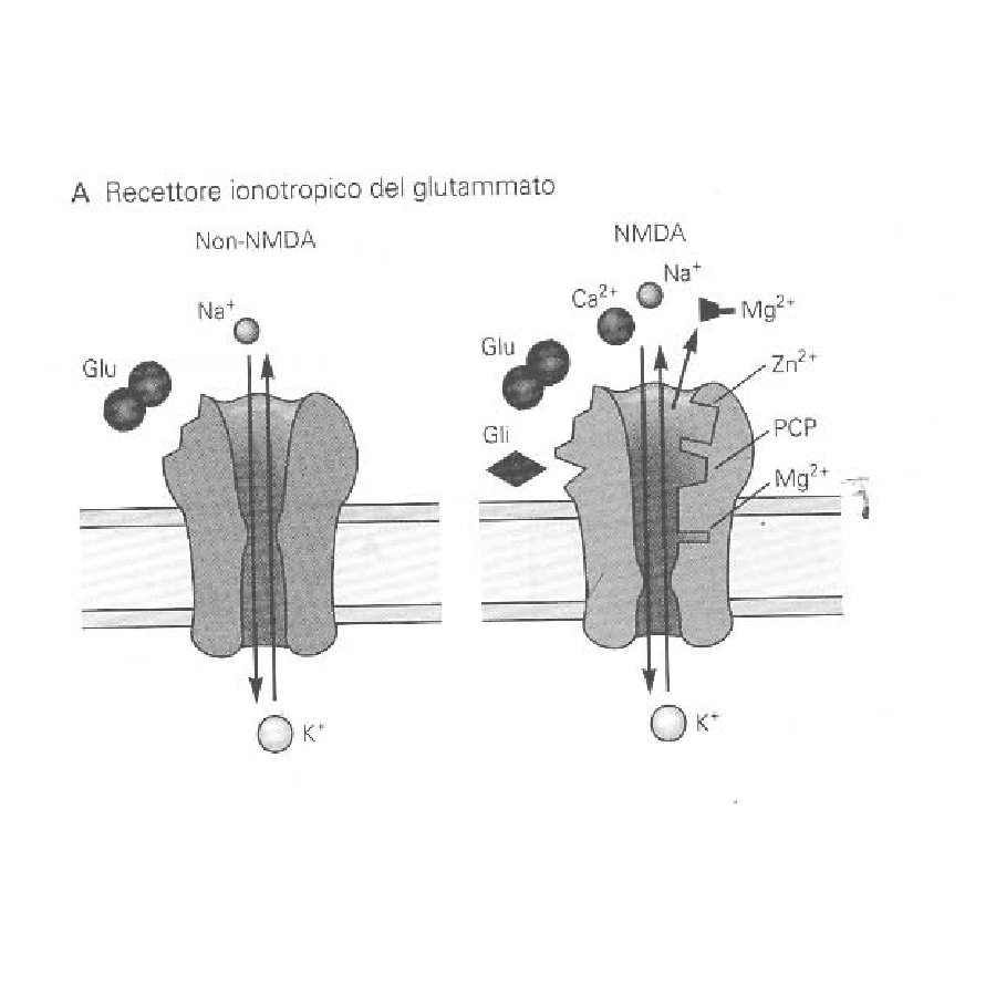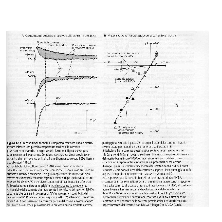 I recettori di tipo non NMDA danno origine, ad es. nei motoneuroni, alla componente precoce del EPSP in risposta alla stimolazione delle fibre afferenti sensitive primarie. Questi recettori attivano canali cationici a conduttanza bassa ( <<20 ps) permebaili al Na+ e K+ I recettori di tipo NMDA intervengono e sono resposabili della componenente tardiva del EPSP. Tre caratteristiche: 1) Controllano un canale cationico a conduttanza elevata (50 ps), permebile al Na+, K+ e Ca+ 2) L’apertura del canale richiede anche la glicina o la D-serina (D-serine racemase) 3) L’apertura dipende dal voltaggio della membrana (che rimuove la molecola del Mg++ che si trova all’interno del canale) E’ inibito dalla FENICICLINA o PCP o polvere degli angeli una sostanza allucinogena che si lega a un sito localizzato all’interno del poro-canale aperto. Il blocco dei recettori NMDA dà origine a sintomi che richimano le allucinazioni che si osservano nei pazienti affetti da schizofrenia