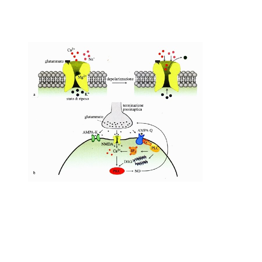 All’effetto citotossico della stimolazione dei recettori del glutammato sono state attribuite anche patologie psichiatriche: 1) la demenza pugilistica 2) la sindronme di Korsakoff negli alcolisti 3) la schizofrenia da danno cerebrale intrauterino ( ipofunzione dei Glu-R) 4) l’autismo infantile 5) la epilettogenesi , specie il processo di generalizzazione delle convulsioni Tossine alimentari: 1) ACIDO DOMOICO: veleno prodotto da alcune conchiglie di mare attiva i recettori del kainato, provoca MORTE o GRAVI DEFICIT MEMORIA 2) CYCAS CIRCINALIS: (cicade originaria dell'India meridionale. ) contiene BMAA (b-N-methylamino-L-alanine) che in presenza di bicarbonato attiva AMPAR e NMDAR (isola di Guam nel Pacifico: ALS) 3) LATHYRIUS SATIVUS: (è un legume, comunemente chiamato Cicerchia) causa il LATIRISMO provoca 1) disturbi degli arti inferiori dopo lunghi periodi di assunzione, dovuta all'aminoacido 2) β-N-Oxalyl-L-α, β-diaminopropionico acido, è diffusa soprattutto nel continente asiatico Il Glutammato, lo NMDA e il Kainato sono delle potenti neuro-tossine 1970: somministrati per via orale negli animali immaturi: acuta neurodegenrazione nelle zone non protette da barriera ematoencefalica (nucleo arcuato, ipotalamo) Acido kainico: selettiva lesione dei neuroni ippocampali area CA 3 e crisi epilettiche