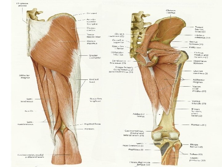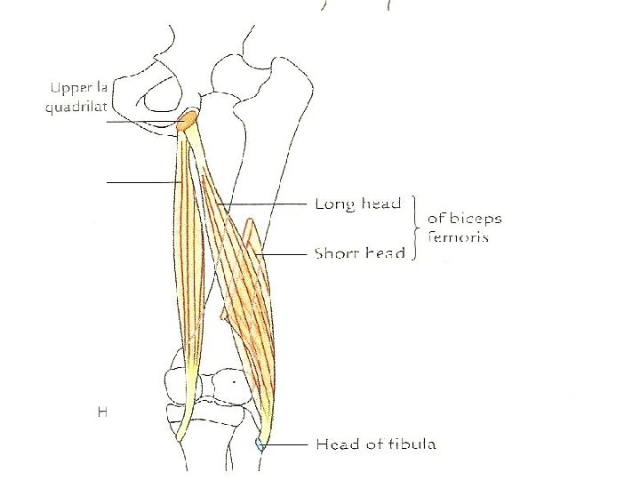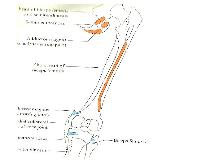 POSTERIOR COMPARTMENTTHIGH • Hamstrings • Characteristics: orgin-ischial tuberosity insertion: -tibia or fibula supply: - tibial part of sciatic nerve flexor of knee, extensor of hip.