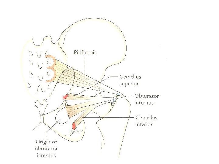 GLUTEAL MUSCLES • Sup layer: -gluteus maximus , tensor fasciae latae. • Intermediate: gluteusmedius, piriformis, obturator internus with gemeli superior and inferior. • Deep : -gluteus minimus