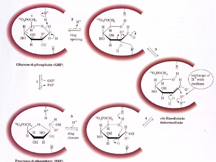 Phosphoglucose Isomerase Uses an “ ene dione intermediate 1) Substrate binding 2) Acid attack by H 2 N-Lys opens the ring 3) Base unprotonated Glu abstracts proton from C 2 4) Proton exchange 5) Ring closure