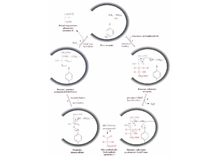 There are two classes of Aldolases Class I animals and plants - Schiff base intermediate Step 1 Substrate binding Step 2 FBP carbonyl groups reacts with amino LYS to form iminium cation (Schiff base) Step 3. C 3 -C 4 bond cleavage resulting enamine and release of GAP Step 4 protonation of the enamine to a iminium cation Step 5 Hydrolysis of iminium cation to release DHAP + + Na. BH 4