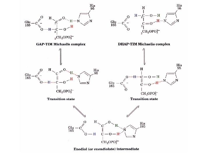 TIM has an enediol intermediate GAP enediol DHAP Transition state analogues Phosphoglycohydroxamate (A) and 2 -phosphoglycolate (B) bind to TIM 155 and 100 times stronger than GAP of DHAP B. A.