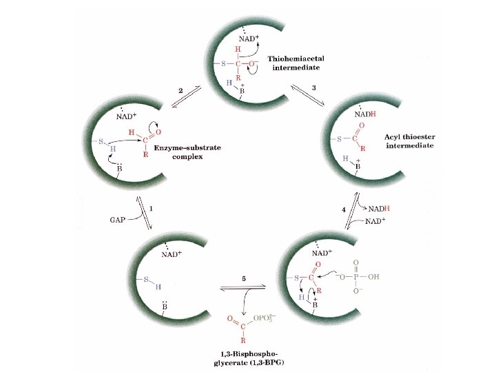 Mechanistic steps for GAPDH 1. GAP binds to enzyme. 2. The nucleophile SH attacks aldehyde to make a thiohemiacetal. 3. Thiohemiacetal undergoes oxidation to an acyl thioester by a direct transfer of electrons to NAD+ to form NADH. 4. NADH comes off and NAD+ comes on. 5. Thioester undergoes nucleophilic attack by Pi to form 1, 3 BPG. The acid anhydride of phosphate in a high energy phosphate intermediate