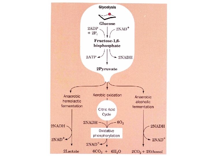Oxidizing power of NAD+ must be recycled NADH produced must be converted back to NAD+ 1. Under anaerobic conditions in muscle NADH reduces pyruvate to lactate (homolactic fermentation). 2. Under anaerobic conditions in yeast, pyruvate is decarboxylated to yield CO 2 and acetaldehyde and the latter is reduced by NADH to ethanol and NAD+ is regenerated (alcoholic fermentation). 3. Under aerobic conditions, the mitochondrial oxidation of each NADH to NAD+ yields three ATPs