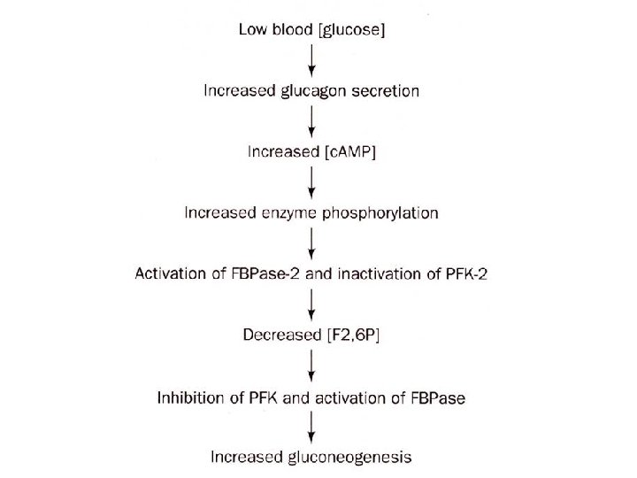 During the well-fed state: low level of Glucagon and high level of insulin elevated fructose 2, 6 -bisphosphate act as intracellular signals indicating the glucose is abundant activate the glycolysis During starvation: elevated glucagon and low level of insulin decrease the glycolysis and increase the gluconeogenesis
