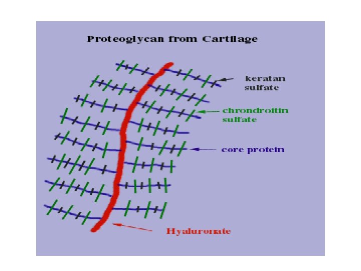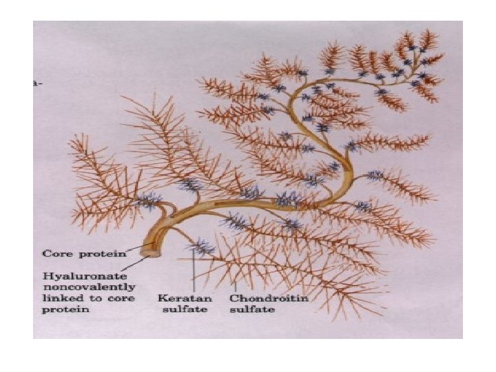 The GAGs extend perpendicularly from the core in a brush-like structure. E. g. in cartilage proteoglycan the GAGs present are chondriotin sulfate and keratan sulfate.