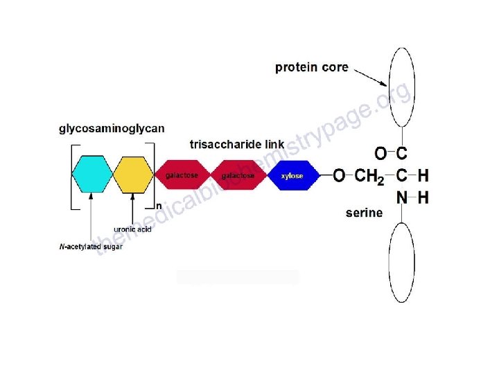 Linkage The linkage of GAGs to the protein core involves a specific trisaccharide composed of two galactose residues and a xylose residue (Gal-Xyl-O-CH 2 protein).