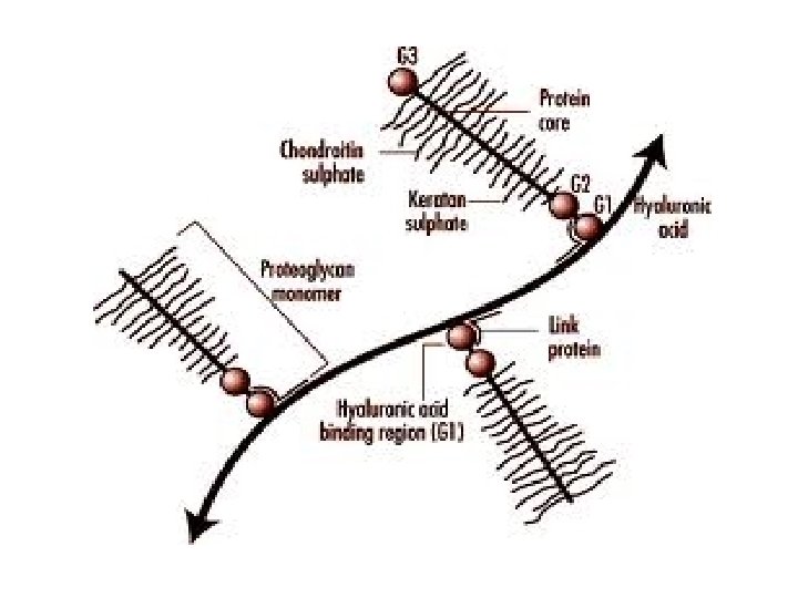 Proteoglycan Aggregates Proteoglycan monomers associate with a molecule of hylauronic acid to form proteoglycan aggregates. Association is not covalent but ionic between hyaluronic acid and the core protein. Stabilized by link proteins