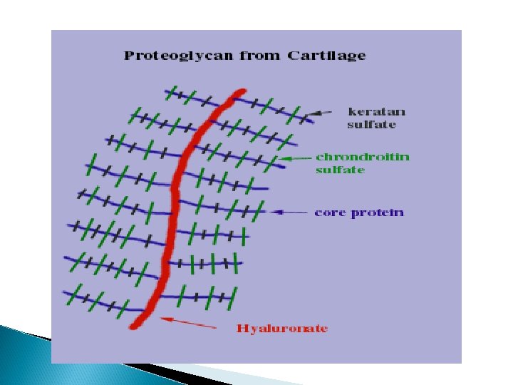 A. Relationship between GAG structure and function - large # of –ve charges, tend to be extended in solutions. - repel each other and are surrounded by a shell of water molecules. - , they “slip” past each other, consistency of mucous secretions & synovial fluid - GAGs is compressed, the water is “squeezed out” & the GAGs are forced to occupy a smaller volume. When the compression is released, the GAGs spring back to their original, hydrated volume because of repulsion of their –ve charges. - This property contributes to the resilience of synovial fluid & the vitreous humor of the eye.
