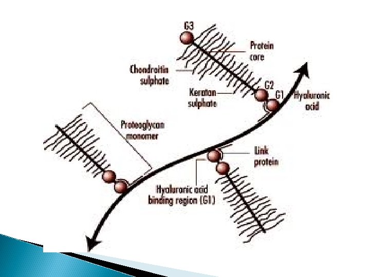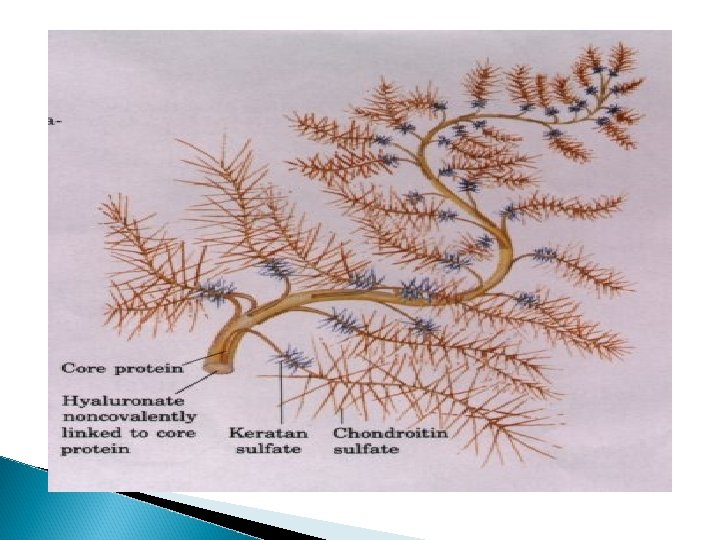 The GAGs extend perpendicularly from the core in a brush-like structure. E. g. in cartilage proteoglycan the GAGs present are chondriotin sulfate and keratan sulfate.