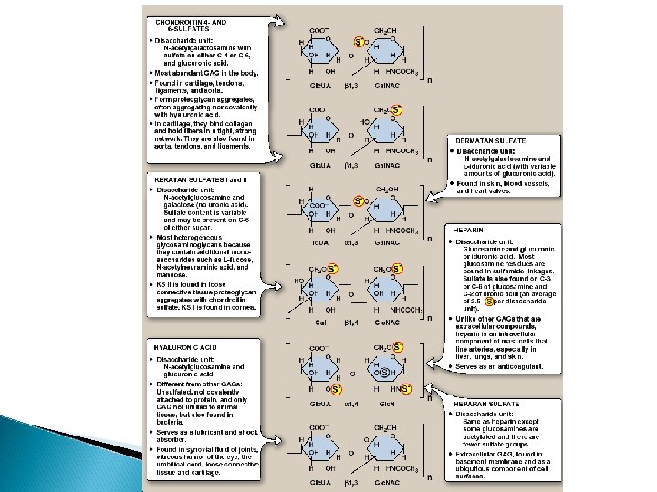 Glycosaminoglycans overview Glycosaminoglycan (GAGs) are large complexes of negatively charged heteropolysaccharide chains. They are generally associated with a small amount of protein, forming proteoglycans, which typically consist of > 95% CHO. Note: this is in comparison to the glycoproteins, which consist primarily of protein with a small amount of CHO Glycosaminoglycans have the special ability to bind large amounts of water, thereby producing the gellike matrix that forms the basis of the body’s ground substance The viscous, lubricating properties of mucous secretions also result from the presence of GAGs, which led to the original naming of these cpds as mucopolysaccharides