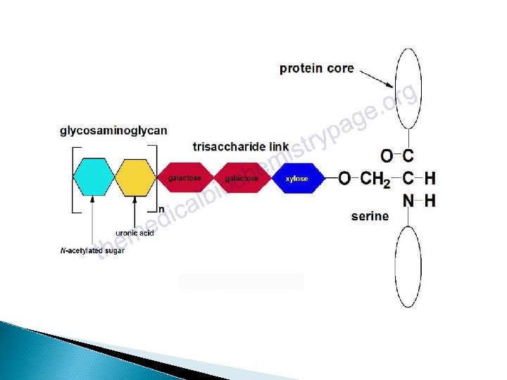 Linkage The linkage of GAGs to the protein core involves a specific trisaccharide composed of two galactose residues and a xylose residue (Gal-Xyl-O -CH 2 -protein).