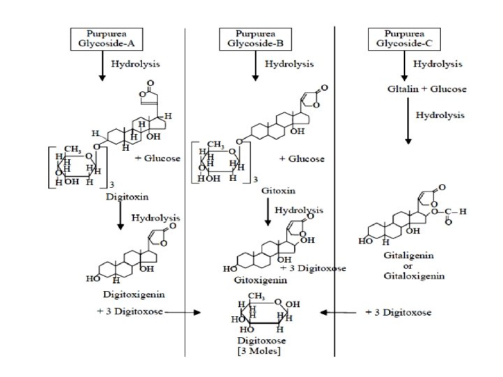 A. DIGITALIS 1. Digitalis purpurea : (Foxglove; Purple foxglove) Digitalis purpurea(Scrophulariaceae) [ The word purpurea has been derived from the purple colour of flowers]. It has been reported that digitalis essentially contains three important primary glycosides namely: Purpurea glycoside A, Purpurea glycoside B, and Purpurea glycoside C, which upon hydrolysis give rise to digitoxin, gitoxin and gitalin respectively. These secondary glcosides on further hydrolysis yields noncarbohydrate moieties (called aglycones or genins) digitoxigenin, gitoxigenin and gitaligenin respectively.