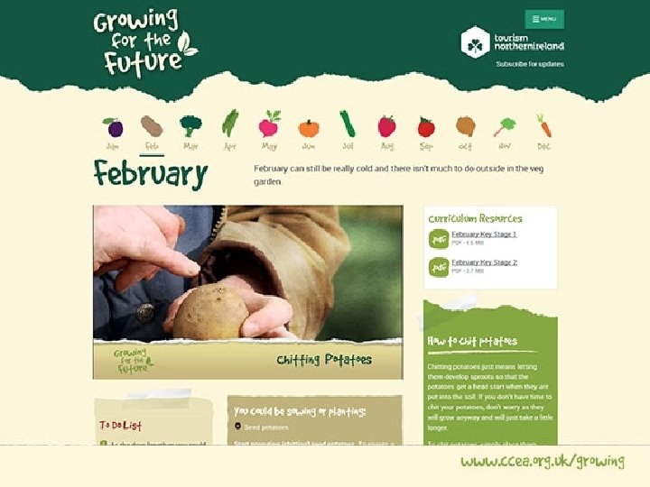• Monthly growing guide for the calendar year • February Chitting potatoes • Curriculum Activities • Get Inspired! • Get Cooking! • Get Growing! • Video diaries in Jilly’s Garden