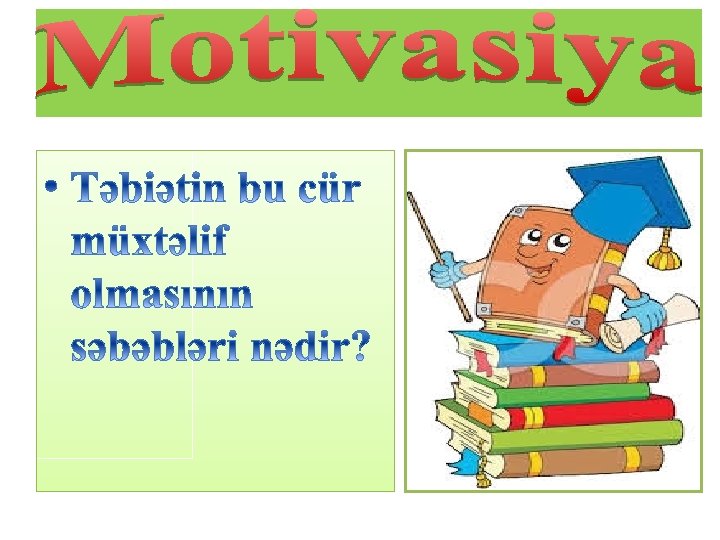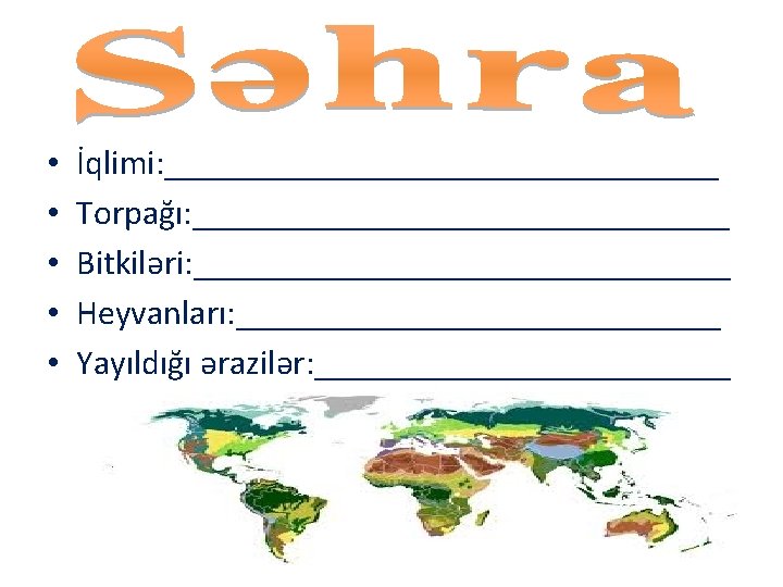 • Alt standart: • • • 2. 1. 7. Biosferin digər təbəqələr ilə əlaqəsini şərh edir. 2. 1. 8. Təbii zonalar xəritəsini oxuyur. • Dərsin məqsədi: Təbii zonaların yaranması qanunauyğunluqlarını şərh • Mövzu: Müxtəlif ərazilər üçün xarakterik olan təbii zonaları edir xəritədə göstərir • • İnteqrasiya: İş forması: İş üsulları: Resurslar: heyvan rəsmləri. Biosfer mövzusu , Riyaziyyat kiçik qruplarla və kollektivlə iş Müzakirə, Beyin həmləsi, Numayiş Dərslik, videoçarxlar, iş vərəqləri, lövhə üçün yapışqan, marker, xəritə, atlas, http: //w. w. w. youtube. com Dərsin gedişi