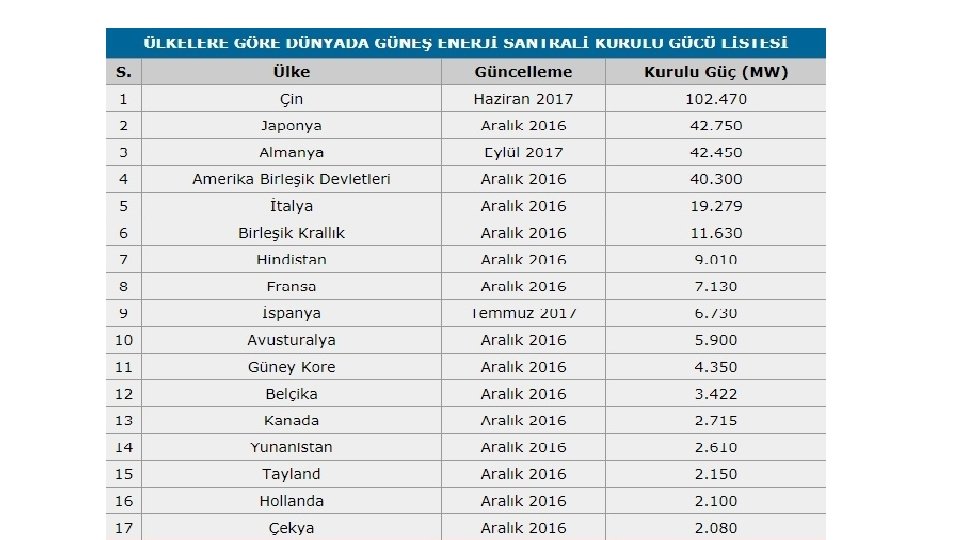 Kaynakça: Dinçer F. , (2011), KSU Mühendislik Dergisi, Türkiye’de Güneş Enerjisinden Elektrik Üretimi Potansiyeli - Ekonomik Analizi ve AB Ülkeleri ile Karşılaştırmalı Değerlendirme: 10) Kılıç, F, (2015), GÜNEŞ ENERJİSİ, TÜRKİYE’DEKİ SON DURUMU VE ÜRETİM TEKNOLOJİLERİ, Kocaeli, s. 32, 33 Demir, H. (2009). Dünya'da ve Türkiye'de Güneş Enerjisi. Dünya Enerji Konseyi Türk Milli Komitesi. BP Statistical Review of World Energy 2016 ETKB, GüneşEnerjisive. Teknolojileri, (http: //www. eie. gov. tr/yenilenebilir/g_enj_tekno. aspx) FF Conserve Energy Future, (https: //www. conserve-energy-future. com/) http: //www. enerji. gov. tr/index. php? dil=tr&sf=webpages&b=gunes&bn=233&hn=&nm=384&id=40695 adresinden alınmıştır http: //eusolar. ege. edu. tr/yenilenebilir_enerji_kaynaklari. html. (tarih yok). Ege Üniversitesi Güneş Enerjisi Enstitüsü: http: //eusolar. ege. edu. tr/yenilenebilir_enerji_kaynaklari. html adresinden alınmıştır International Energy Agency. (2013). World Energy Outlook 2013