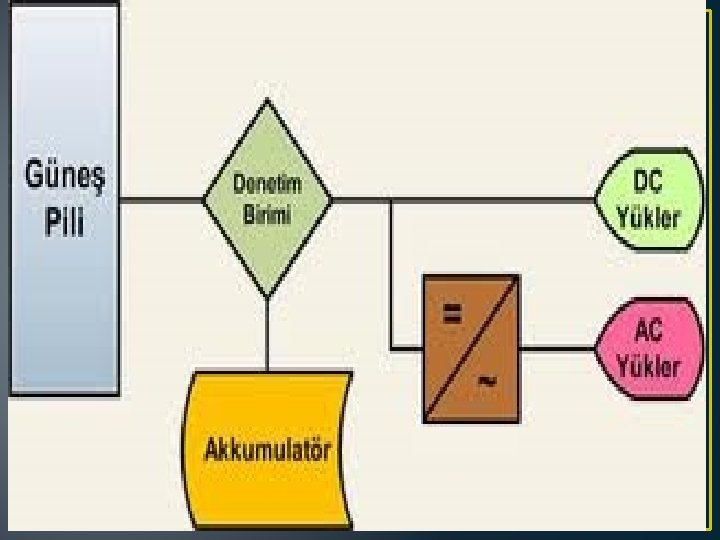 BAĞIMSIZ GÜNEŞ PİLİ SİSTEMLERİ v. Bu sistemde yeterli sayıda güneş pili modülü , enerji kaynağı olarak kullanılır. v. Güneşin yetersiz olduğu zamanlarda ya da özellikle gece süresince kullanılmak üzere sistemde akü bulundurulur. v. Güneş pili modüllleri gün boyunca elektrik enerjisini üreterek bunu , aküde depolar , yüke gerekli olan enerji aküden alınır. v. Akünün aşırı şarj ve deşarj olmasını engellemek için regülatör akımı çeker.