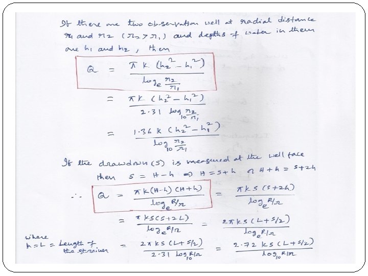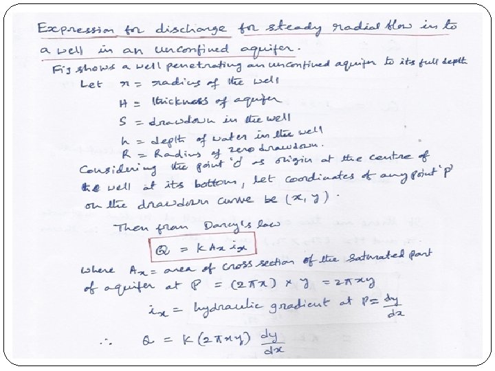 Well Hydraulics For laminar flow conditions a saturated soil, the rate DARCY’Sin. LAW of flow or discharge per unit area is proportional to hydraulic gradient q α i q = ki or Q=ki. A or V = ki Where Q = discharge in cumecs q = Q/A = discharge per unit area k = coefficient of permeability i = hydraulic gradient