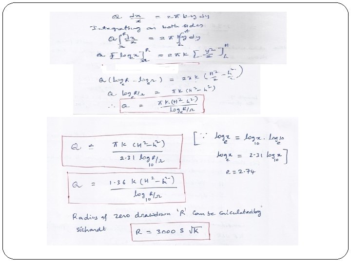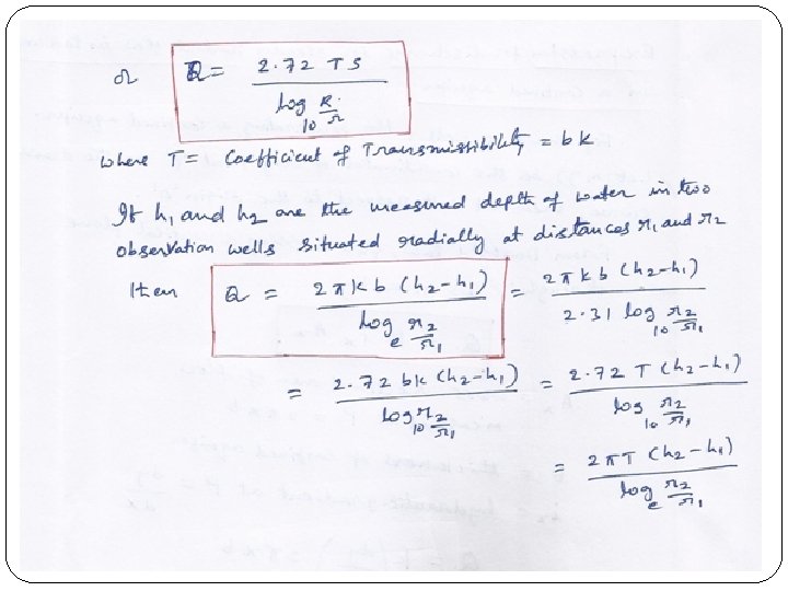 RECUPERATION TEST Topic outside syllabus 1. In recuperation test, water level is depressed to any level below the normal and the pumping is stopped. 2. The time taken for the water to recuperate to the normal level is noted. 3. The discharge from the well is calculated using the formula