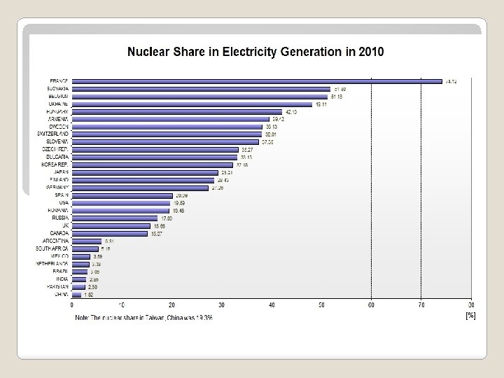Elektrik üretiminde nükleer enerjinin payı §Elektrik üretiminde nükleer enerjinin payı ülkeden ülkeye değişiklik göstermektedir. Elektrik üretiminde nükleer enerjinin payı en yüksek %74. 12 ile Fransa’dadır. Bunu Slovakya ve Belçika izlemektedir. §Bu oranlara rağmen bugün Avrupa ülkeleri başta olmak üzere gelişmiş ülkeler nükleer santrallerden kurtulmanın yollarını aramaktadır. Avrupa’da 1989 yılında 177 olan reaktör sayısı 2010 yılında 143’e düşmüştür.