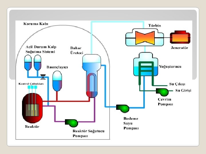 Nükleer enerjiden elektrik üretimi §Nükleer güç santralleri, nükleer yakıtın (örn. Uranyum) fisyon tepkimesine girerek bölünmesi sonucunda açığa çıkan yüksek miktarda enerjiyi kullanır. § Açığa çıkan enerji ile suyun çok yüksek sıcaklıklara kadar ısıtarak buharlaştırması ve yüksek sıcaklıktaki bu buharın, elektrik jeneratörüne bağlı olan türbinlere gönderilmesi ile çalışır. §Türbin dönerken kanatçıklarına çarpan yüksek enerjili buharın, türbin şaftını çevirmesi ile kendisine bağlı jeneratörü döndürerek elektrik enerjisi üretmesini sağlar. §Türbinden çıkan basınç ve sıcaklığı düşmüş buhar, tekrar kullanılmak üzere yoğunlaştırıcıya gider ve su haline geldikten sonra tekrar bölünme ile açığa çıkan enerji ile ısıtılıp buhar haline getirilir ve döngü devam eder