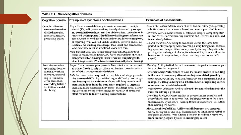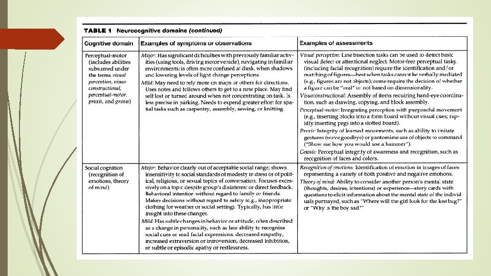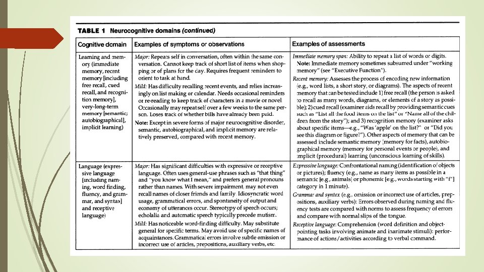 Who and what fits the category of neurocognitive disorders? What is mild neurocognitive impairment Although cognitive deficits are present in many if not all mental disorders (e. g. , schizophrenia, bipolar disorders), only disorders whose core features are cognitive are included in the NCD category. The NCDs are those in which impaired cognition has not been present since birth or very early life, and thus represents a decline from a previously attained level of functioning DSM 5 pp 591 -741 Kaplan and Sadok pp 694 -741 Diagnosis and case formulation Reference: Eramudugolla et al. Alzheimer's Research & Therapy (2017) 9: 15 DOI 10. 1186/s 13195 -017 -0246 -x