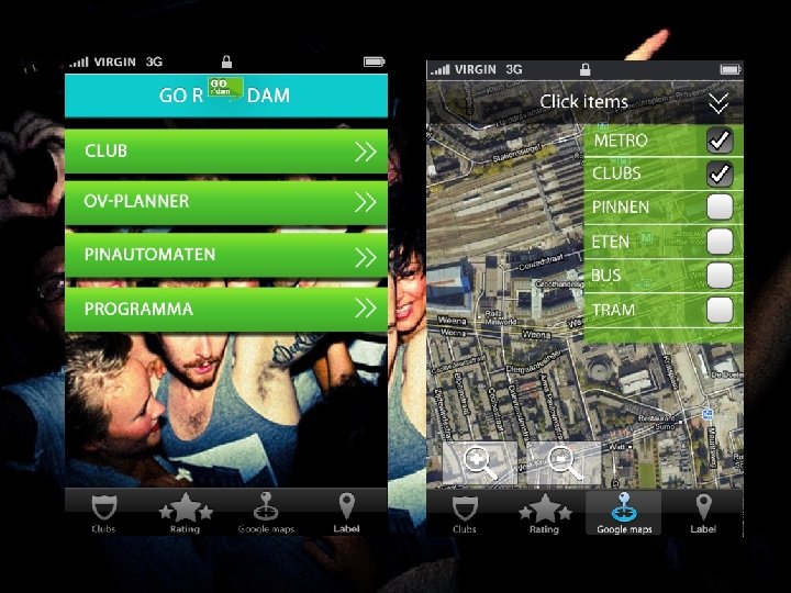 Hoe gebruik je GO Rotterdam 1. Start de app op 2. Je gaat een keuze maken • • Waar zijn mijn vrienden Waar draaien ze goede muziek Wat is het dichtsbij Waar kom ik vaker 3. Je bekijkt de informatie • • Foto’s Rating