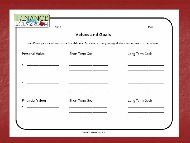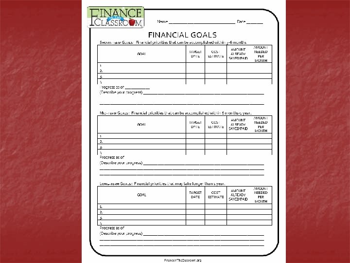 Activity n Create a collage of your financial goals for the future. Use pictures from magazines, clipart from the computer, or your own artwork. The finished collages will be displayed in our classroom.