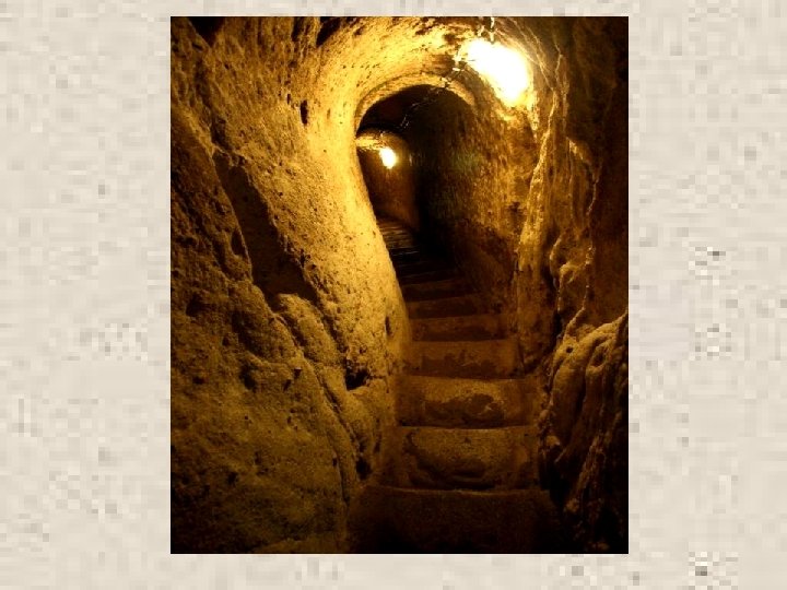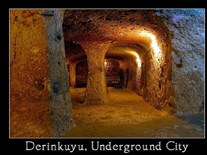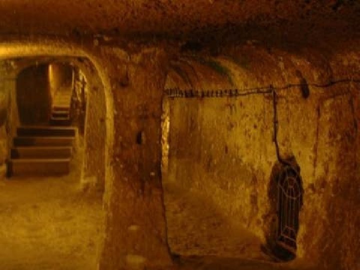 • Unutrašnjost je nevjerojatna: podzemni prolazi u Derinkuyu (u kojem se nalazi prostor za najmanje 10. 000 ljudi) mogu biti blokirani u tri strateški važne točke pomicanjem kružnih kamenih vrata. • Ova teška stijena zatvori hodnik i sprijeći ulaz neprijatelja. Ona je od 1 do 1, 5 metara u visoka, oko 50 cm široka • I teška oko 500 kg.