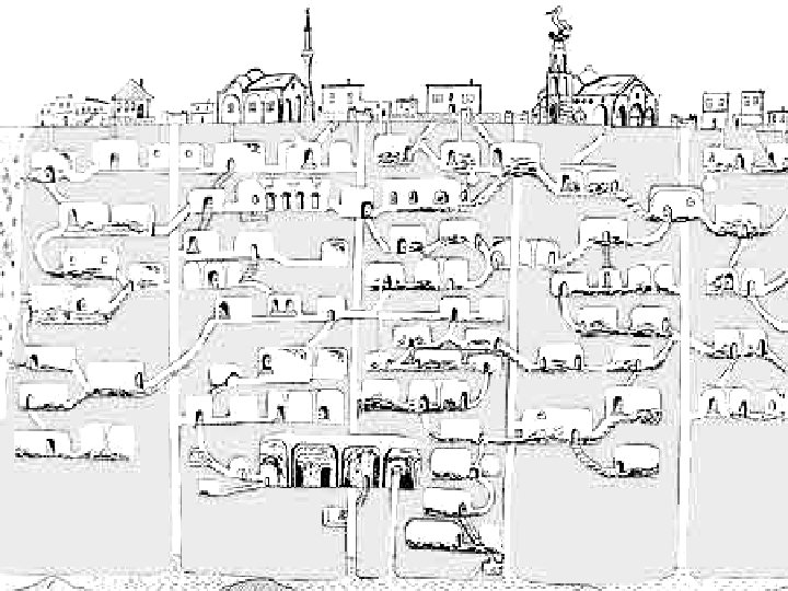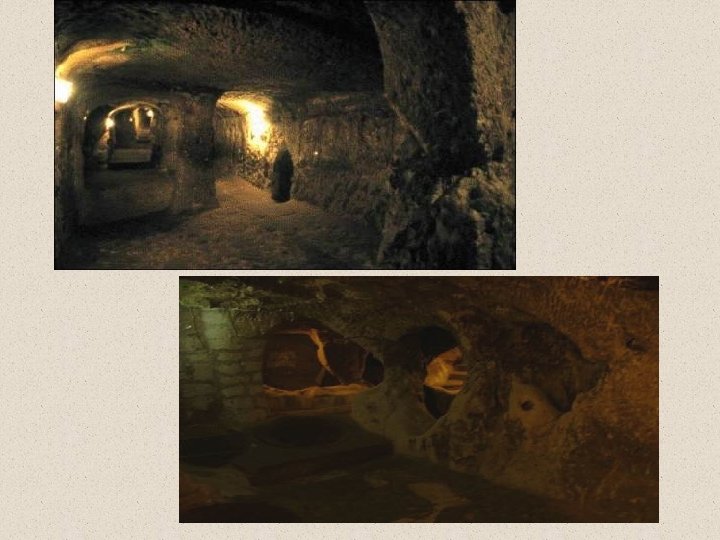 • U podzemnim razinama su smještene: blagavaone, sobe, crkva (20 x 9 metara, sa više od tri metra visine), kuhinje (još pocrnjene od čađe), preše za vino i ulje, skladišta, mjesta za hranu, škola sa brojnim sobama, pa čak i bar.